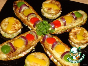 Обжаренные удлиненные кусочки кабачка намазываем полученным фаршем