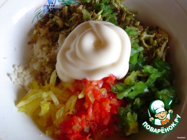 к ней добавляем обжаренный кабачок, сладкий перец и майонез,