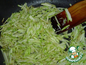 Один кабачок натираем на терке, обжариваем на растительном масле, добавив сушеный лук и чеснок по вкусу. Солим, перчим.