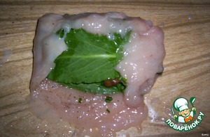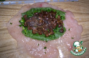 - филе посолить, поперчит, выложить на филе листья щавеля+мелко порезанный лук+грибы