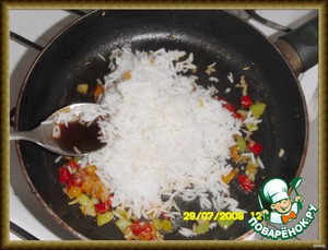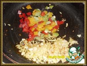 [b]Гарнир.[/b]Нарезать мелко лук, обжарить, затем кладем нарезанные кубиками болгарские перцы (разных цветов)