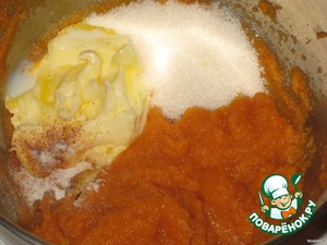 Добавляем к морковному пюре еще 2 ст. л. сахара, размягченное масло, имбирь и корицу, ванилин, коньяк и остальные 70-100 мл воды, все это перемешиваем.