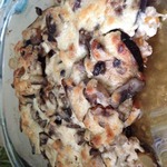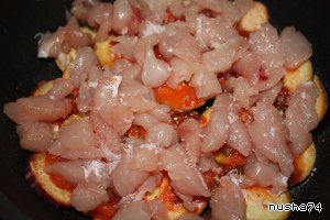 Филе курицы порезать кубиками и выложить на баклажаны. Вылить оставшийся красный соус.
