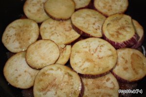 В форму или сковороду нарезать баклажаны кружочками
