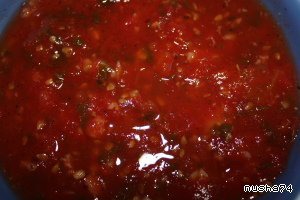 Приготовить красный соус, для этого ошпарить помидоры и снять с них кожицу, измельчить, выложить на сковороду, добавить соль, перец и потушить минут 15, до мягкости помидоров. В конце добавить зелень и чеснок.