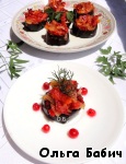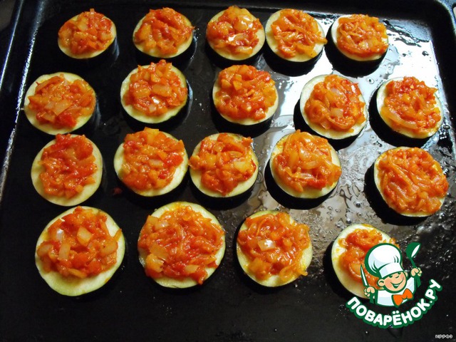 Выложить на противень, сбрызнуть оливковым маслом и сверху положить по ложке овощной смеси. -