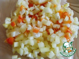 На сковороду, разогретую с оливковым маслом выложить лук и чеснок, немного обжарить и добавить болгарский перец.