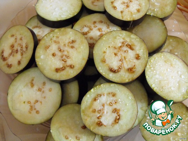 Баклажаны нарезать кружочками толщиной 0,5 см. Посолить, сложить в миску и отставить, чтобы пустили сок, на полчаса.