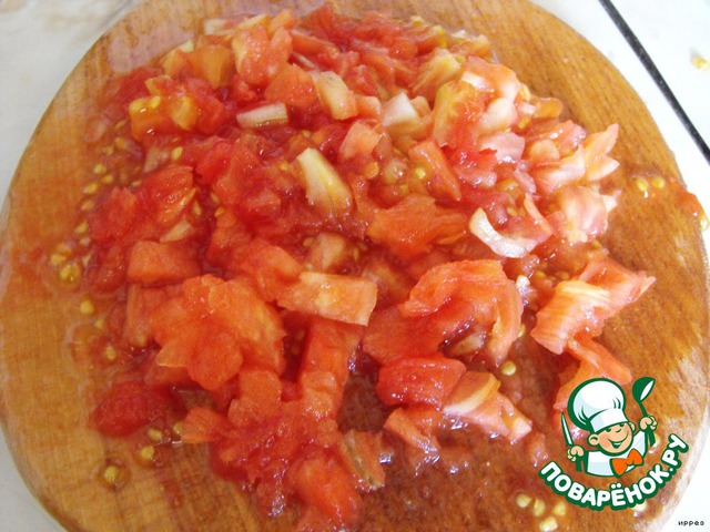 Помидор нарезать мелко, предварительно очистив от кожицы.