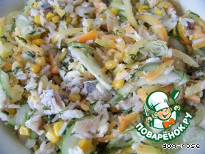 Яйца крошим помельче, можно на терке потереть, добавляем рис, кукурузу.