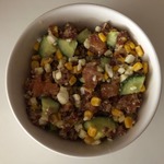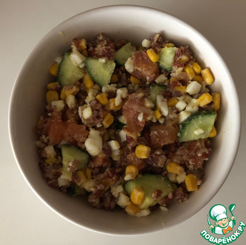 Яйца крошим помельче, можно на терке потереть, добавляем рис, кукурузу.