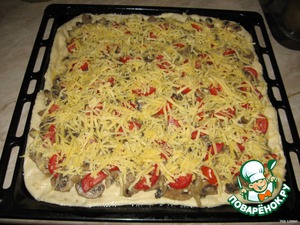На тесто кладём начинку: грибы, потом помидоры, а сверху трем сыр. -