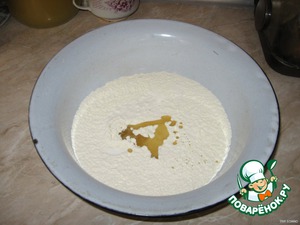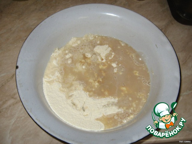 Теперь добавляем эту смесь к муке и хорошо все перемешиваем.