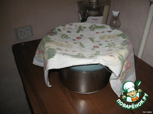 Теперь кладём нашего колобка в миску, накрываем полотенечком и ставим в теплое место примерно на 1 час.