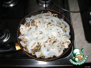 Грибы шампиньоны помыть, порезать и жарить с луком, пока испарится жидкость. Потом добавить сметану, посолить, поперчить и тушить еще минут 15. -