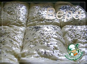 Острым ножом разрезать подошедшее тесто на полоски. Посыпать маком и кунжутом.