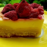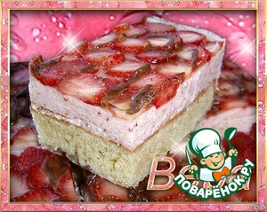 Дать заливке застыть(в холодильнике). Удалить бортики из фольги. Разрезать бисквит на пирожные, вынуть из формы.