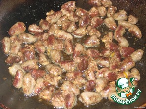 Куриные сердца моем, удаляем пленки и обжариваем на растительном масле.