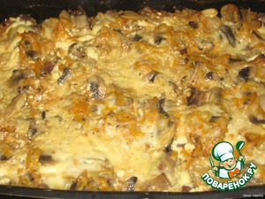 Теперь складываем. Берем форму для запекания кладем драники нижним слоем, затем куриные сердца, сверху выкладываем грибы, затем слой майонеза и посыпаем сыром, добавляем немного водички. Ставим в духовку на 40-50 минут при температуре 200 С.