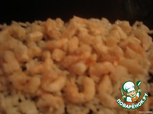Обжарить лук на сливочном масле, уложить на креветки, сверху сыр потертый на терке