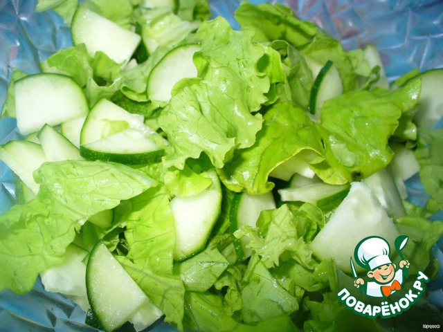 Зеленый салат режем или рвем руками на достаточно крупные кусочки, огурец режем четвертинками колечек. Всё складываем в салатник.