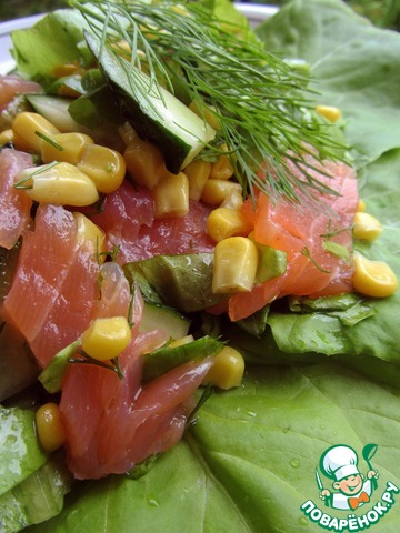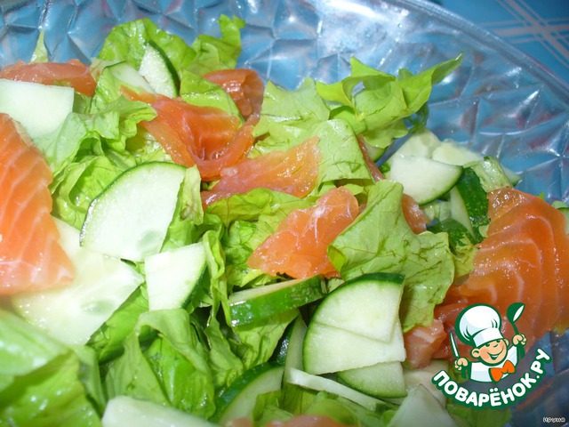 Добавляем нарезанную тонкими ломтиками форель. Я солю сама по рецепту Ксюши Lacoste http://www.povarenok .ru/recipes/show/430 3/, получается замечательная рыбка.