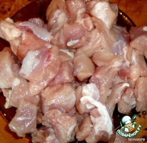 • 250 г свинины нарезаем такими-же кусочками, оставшееся мясо, также, перекручиваем.