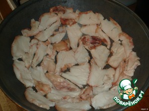 Режем курдюк на большие,нетонкие куски.Потом из них получатся НАИВКУСНЕЙШИЕ выжерки,которые мы подадим с блюдом.