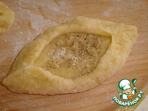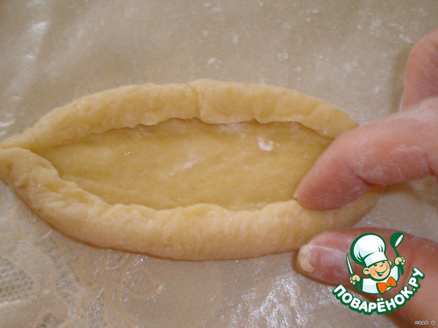 Раскатаем в овальную лепешку.Пару раз прокатите скалкой поверху