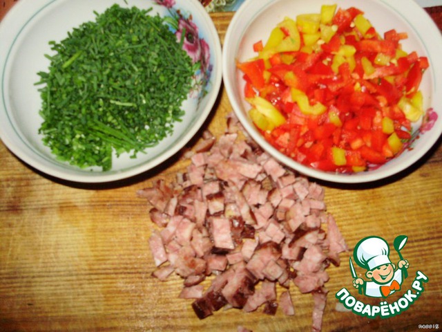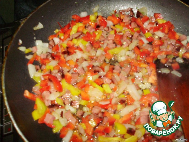 Нагреваем сковороду, растапливаем масло и лбжариваем лук до золотистого цвета, добавляем копчености - жарим пару минут, и паприку все перемешиваем и оставляем остывать.