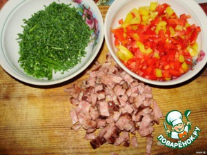 Лук, паприку и колбасу нарезаем кубиками (На фото лук зеленый - лучше брать репчатый)