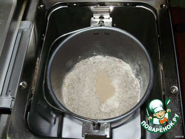 В котел хлебопечки кладем молоко, соль, муку, дрожжи. Ставим на замес ( в моем варианте это режим Хлеб, время 3.45)
