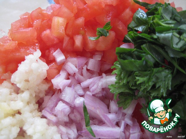 [color=darkred][b]Го товим маринад:[/b][/color] нарезаем очень мелко помидоры, лук, чеснок и зелень; выкладываем в салатницу.