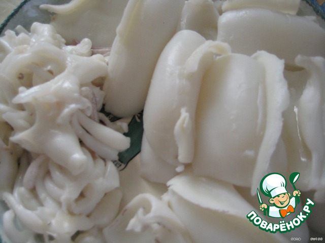 Очищеные тушки кальмаров разрезать вдоль на 4 части и на 1-2 секунды опустить в кипяток;