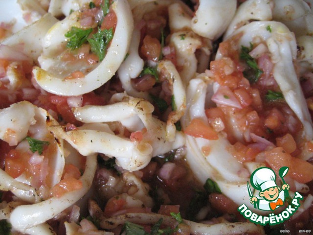 Даже и не знаю, как назвать это блюдо - закуска, салат или "кальмары на гриле". Но, если любите кальмары и пикантные блюда - вам, непременно, понравится этот свежий вкус с легкой "остринкой".