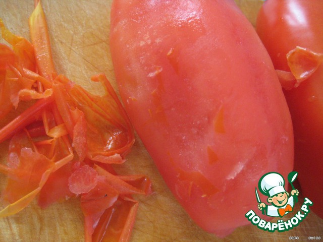 Помидоры залить кипятком на несколько секунд и и очистить от кожицы.