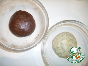 Из муки, яиц, маргарина, сахара, соли, соды и мака замесите тесто. Разделите его на две части, в одну из них добавьте какао. Оставьте на 30 минут в холодитьнике