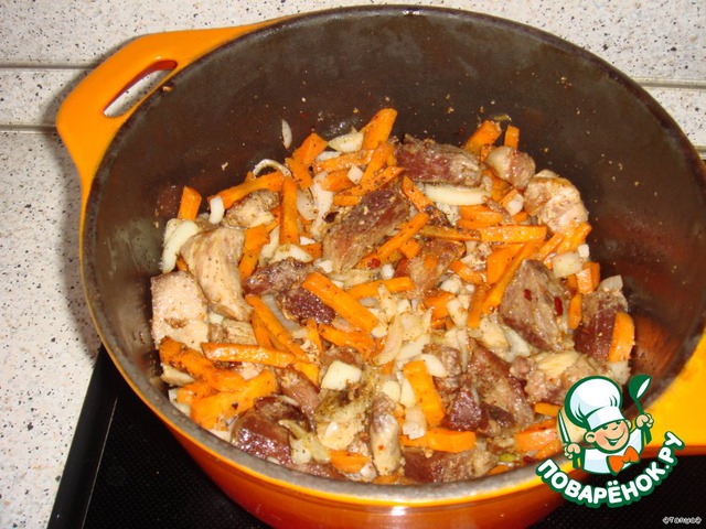 • В готовое мясо добавить морковь и лук, обжарить до золотистого цвета (минут 15-20).