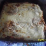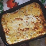 Сверху заливаем молочным соусом, посыпаем тертым сыром и запекаем в духовке около 30 -40 минут (до зарумянивания)