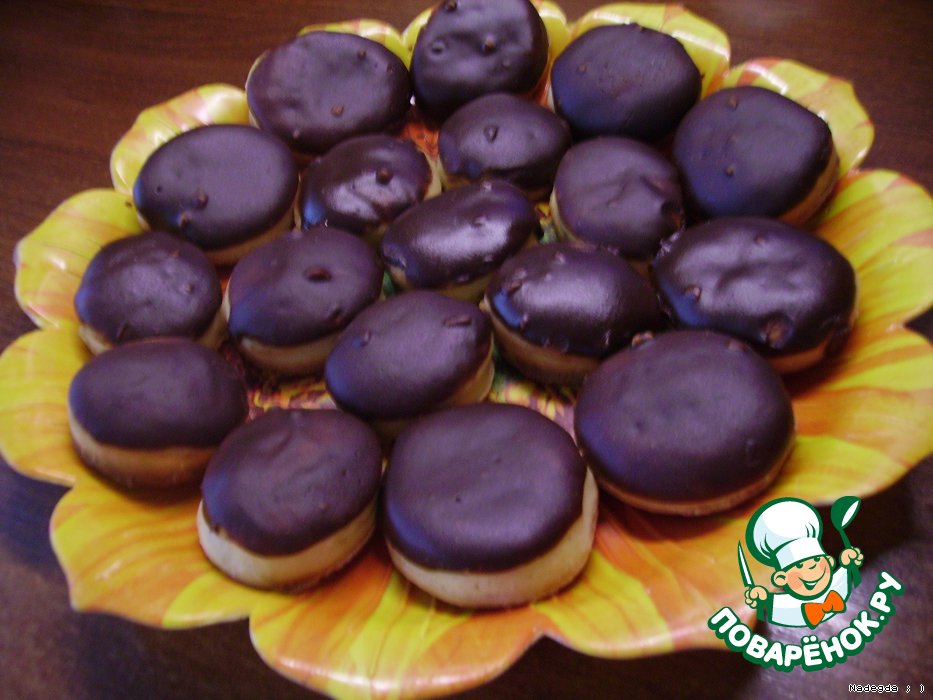 Противень смазать маслом и выложить на него получившиеся кружочки. Выпекаем при температуре 200 – 250 градусов около 20 минут. В это время на паровой бане расплавить плитку шоколада и немного сливочного масла. Готовому печенью даeм немного остыть, после чего осторожно окунаем его верхней стороной в шоколадную массу. Выкладываем печенье на большую тарелку или поднос и оставляем на 2 часа до полного высыхания.