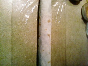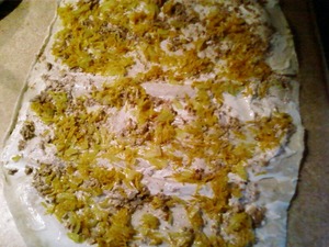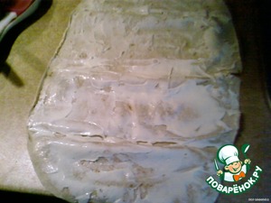Намазываем половину листа лаваша майонезом, а другую плавленным сыром.