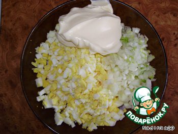 Ингридиенты для верхнего коржа - накрошить мелко кубиками яйца, лук и добавить 3 ст. ложки майонеза и укроп.