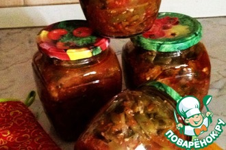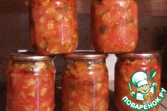 Порезать кубиками кабачки, потереть на терке морковь, порезать мелко чеснок. как только томат закипит добавить уксус, соль сахар и овощи кипятить 40 минут.