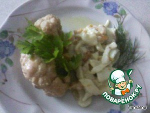 • К кальмарам добавила морковь, лук, соль,перец и сметану.на огне подержала еще 3минуты. На гарнир отварила цветную капусту и потушила пару минут в помидоровом соке.