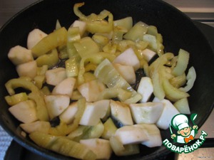 Четвертым слоем будет перец и яблочки, обжаренные слегка.