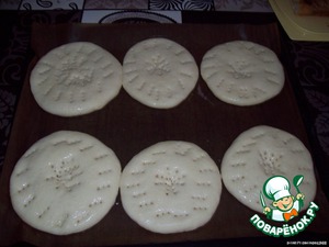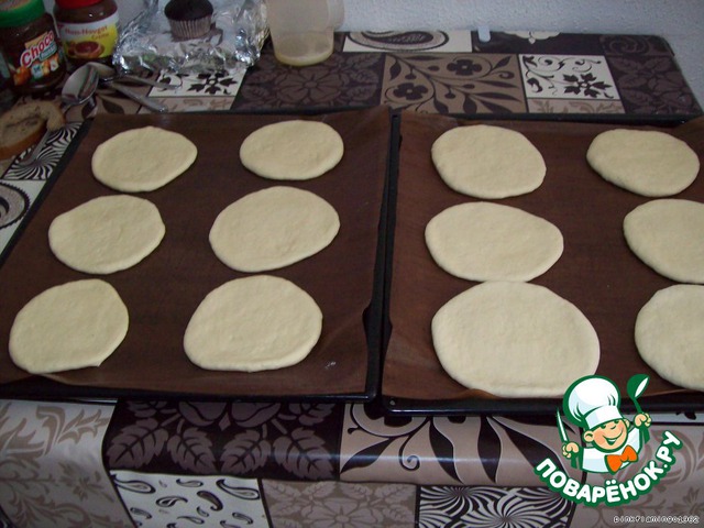 Их раскатываем скалкой в лепeшки - не сильно тонкие, примерно 1 см. Выкладываем на лист, смазанный маргарином или выложенный бумагой для выпечки, накрываем полотенечком и ставим в тeплое место мин. на 15 -мпусть подойдут и отдохнут.