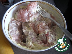 Подготовим курицу. Для этого куриное филе как следует отбиваем с обеих сторон. Солим, перчим ( тоже с обеих сторон, хотя это дело вкуса), укладываем в емкость слоями, каждый смазывая майонезом. Верхний слой тоже. Кусочки лучше делать небольшими.