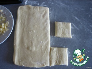 У нас в магазине продают очень вкусное слоено-дрожжевое тесто, поэтому я всегда его покупаю, размораживаю, и разрезаю на небольшие квадратики.