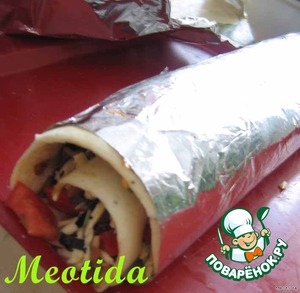 Теперь еще слой фольги, так чтобы весь рулет был со всех сторон в фольге, плотненько