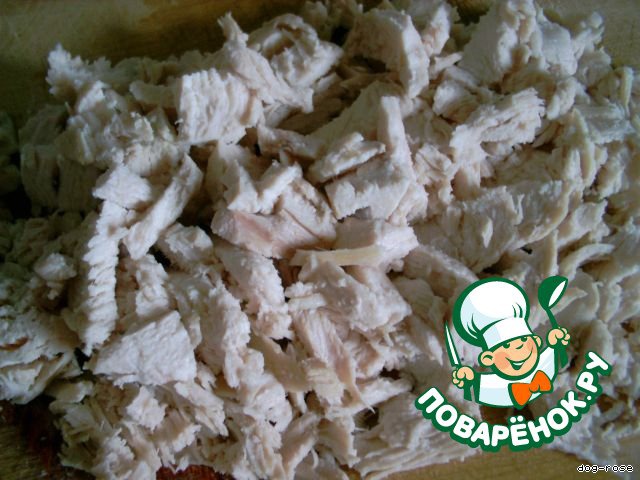 Куриное филе режем помельче, или разбираем на волокна, кому как нравится